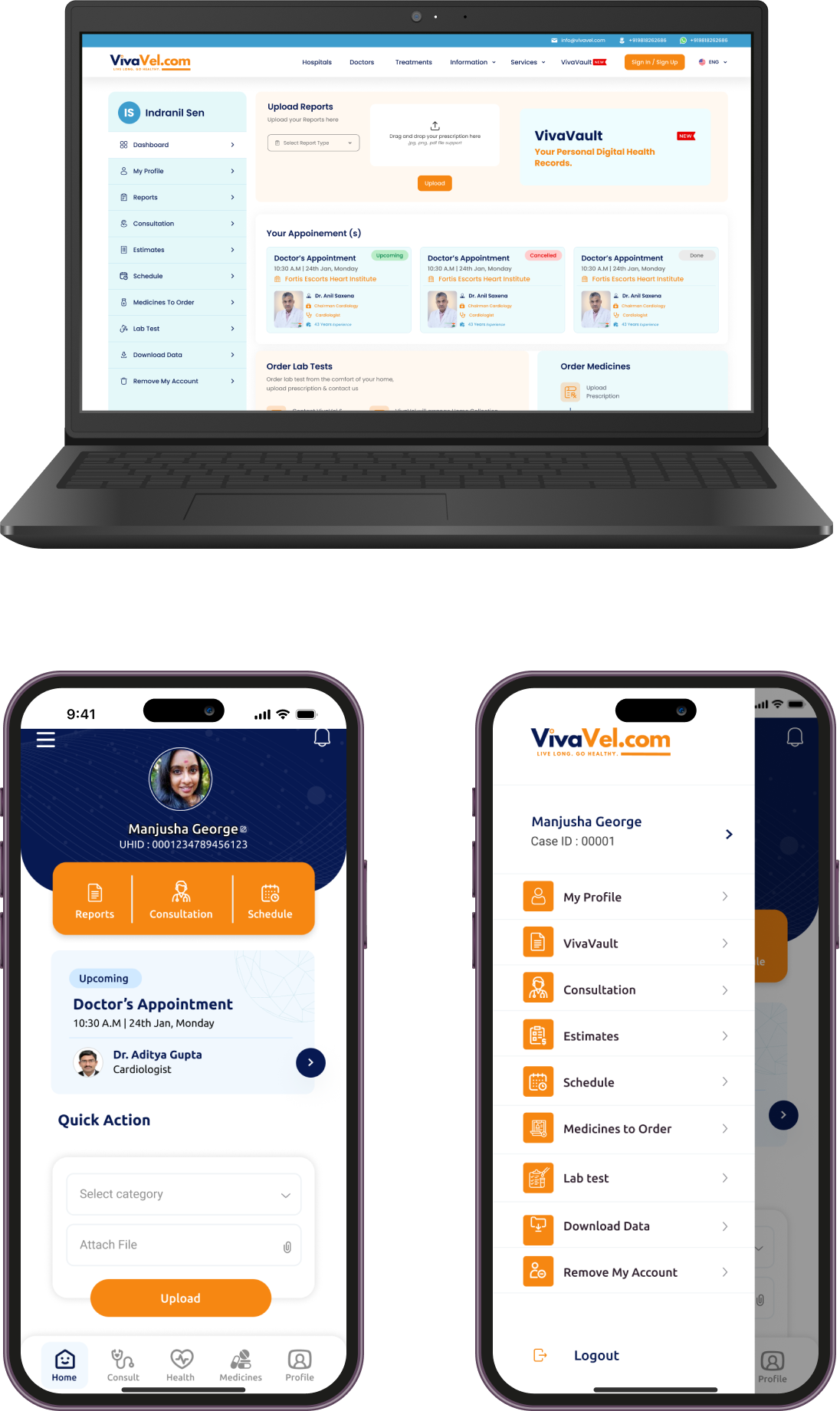 VivaVault simplifies your healthcare journey, keeping it clear, seamless, and worry-free. Secure, globally accessible, and easy to share, it puts your medical records in your hands, upholding VivaVel’s commitment to Reliability, Responsiveness, and Empathy.